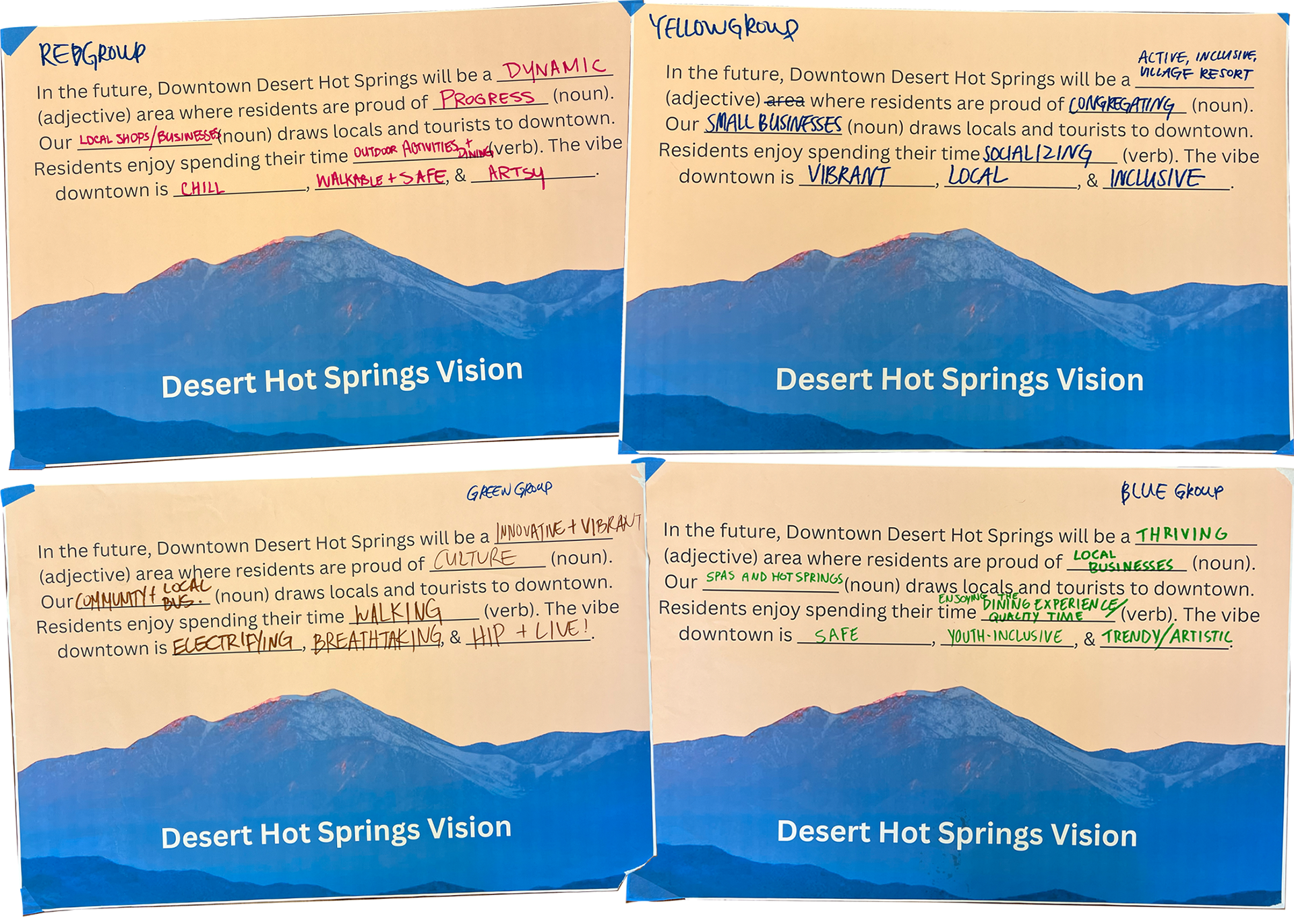 The City and Regional Planning Department at Cal Poly holds an annual second-year masters studio over the course of two quarters (20 weeks). Work for Desert Hot Springs studio began in September of 2022 which included a collective effort to produce an Existing Conditions Report, Community Outreach Report, and a Concept Plan for the downtown. Outreach was conducted over two site visits. For the first visit, tables were set up at two grocery stores and the community center to directly engage with the public. During this time a street audit was also conducted, assessing the quality of buildings, frontages, and pedestrian amenities that were included in the Existing Conditions Report. On the second visit, a community-wide visioning event was held at City Hall with Downtown stakeholders, including residents, small business owners, and City staff–concluding with the vision statements produced below. Further outreach conducted at Desert Hot Springs HIgh School by interviewing and allowing students to post ideas on visioning boards. As further research for the Placemaking Playbook, I conducted a photographic inventory of downtown that included personal interviews with downtown Desert Hot Springs businesses.